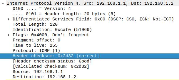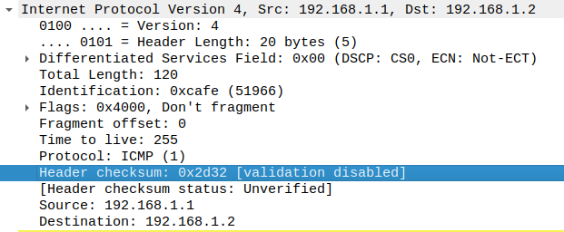 많은 네트워크 프로토콜은 데이터 완결성 또는 일치성을 검증하기 위해 체크섬을 사용하는데, IP 계층의 경우 와이어샤크에서는 기본적으로 체크섬 오프로딩으로 인한 혼란을 회피하기 위해 체크섬에 대한 검증 기능이 비활성화되어 있다.